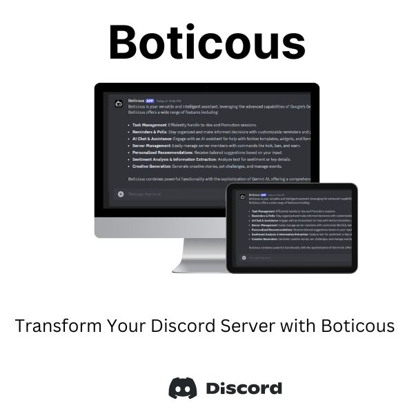 Meet Boticous, your ultimate multifunctional Discord bot designed to transform how you manage your server and boost productivity. Perfect for professionals, content creators, community managers, and general users, Boticous is packed with features to enhance your Discord experience.
